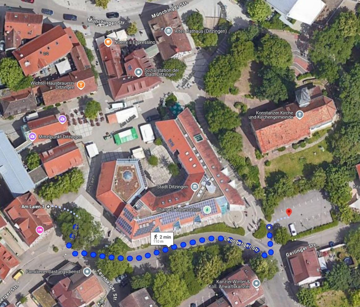 Außerdem kann über die Münchinger Str. die kostenlose Tiefgarage (Ausgang "Am Laien") des Rathauses benutzt werden.